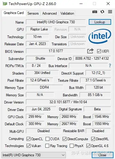 通过 GPU-Z 工具抓取的数据显示,该机型搭载的 UHD 730 核芯显卡在关键参数上实现显著升级。其 Shader 计算单元数量较前代 UHD 630 系列提升明显,显存带宽指标相较于旧版同样获得大幅提升。