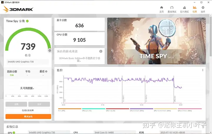 Time Spy 总分 739,显卡得分 636 分。与官网汇总的理论 650 分差距不大。
