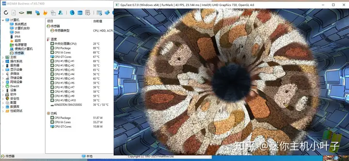 单烤甜甜圈进行稳定性测试,此时核显功耗维持 50W 上下,单烤 GPU 甜甜圈时未能跑到 TDP 功耗。