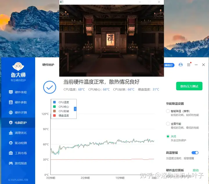 首先使用鲁大师进行散热压力测试,10 分钟左右,温度上升并最终稳定在 68-70℃,但是鲁大师数据略显示有缺陷,无法知道 CPU 的功耗以及是否降频,接下来我将使用更直观的测试软件 AIDA64。