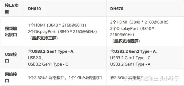 DH670 作为 DH610 的升级版本,在接口配置上实现了显著提升。其主要升级点集中于对显示器支持数量以及接口类型方面(接口速率提升)。