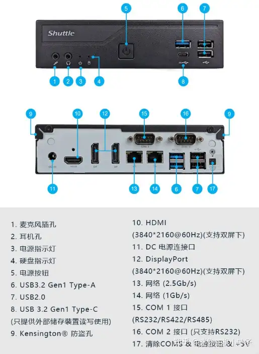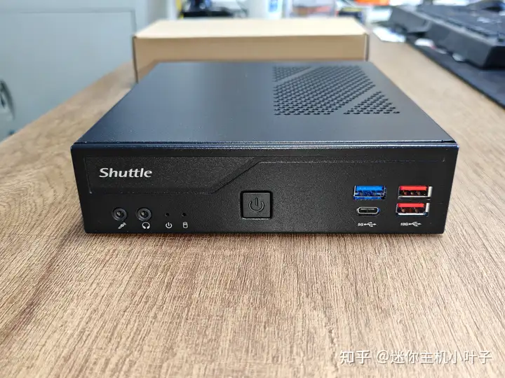 图中展示的就是这台 Shuttle(浩鑫)DH670 品牌的迷你主机。其正面接口从左至右依次为: